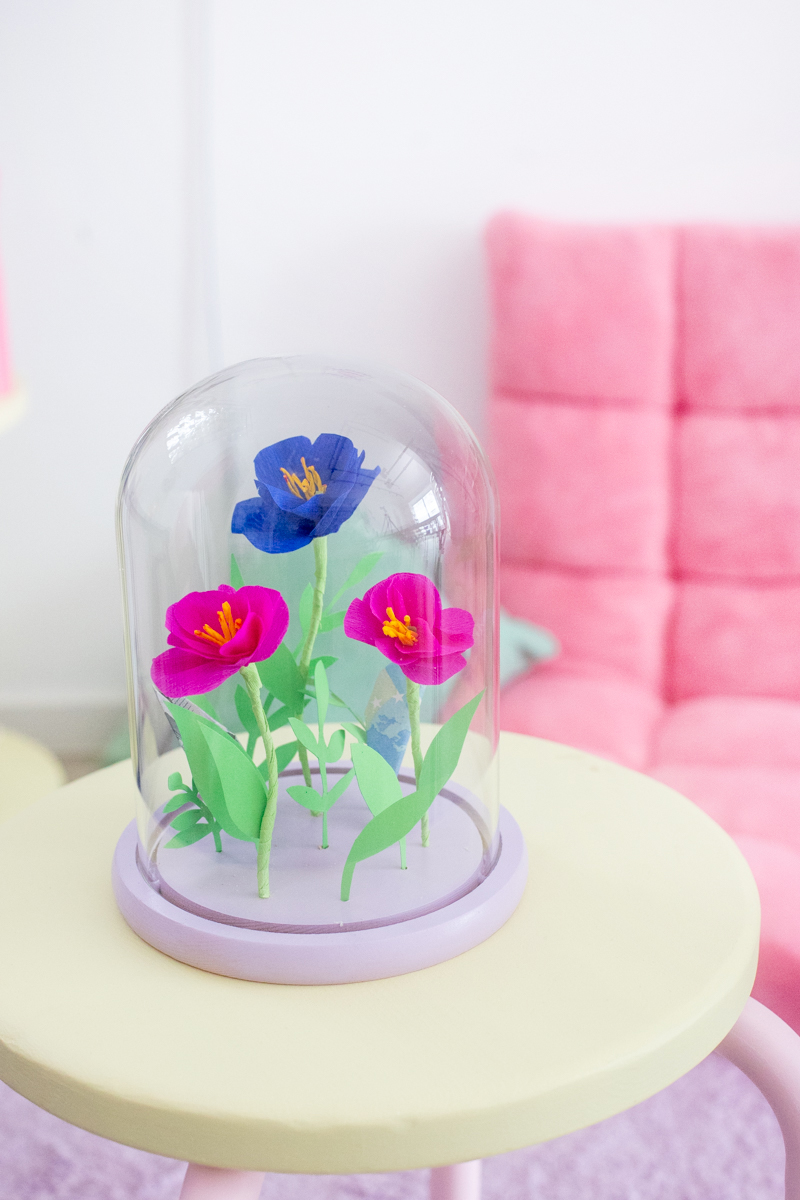 Für mein Projekt habe ich mich für ein Geldgeschenk entschieden, das auch nach dem Schenken eine richtig schicke Deko ist: nämlich Krepppapier-Blumen in der Glaskuppel. Dazwischen verstecken sich Geldscheine, die ich wie Blütenblätter gefaltet habe.