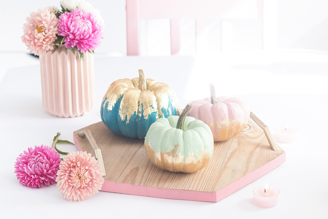 Hier wird’s goldig! Richtig chice DIY-Kürbisse mit Blattgold in wunderschönsten Pastellfarben. Super schön! Auch als Geschenk? Klar! Du kannst deine Kürbisse natürlich auch wunderbar in der Lieblingsfarbe deiner beschenkten Person entwerfen.