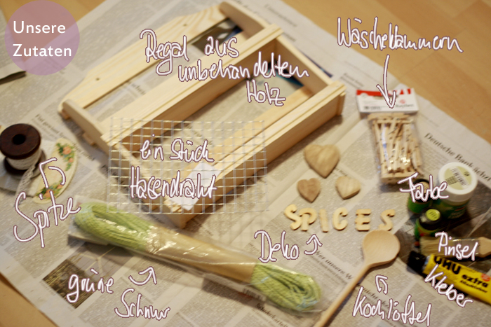 - Sonstige Deko. Ich hab tolle Deko-Buchstaben aus Holz im Listmann entdeckt und mich direkt für die Kombination „SPICES“ entschieden. Und 2 Dekoherzen aus Holz.