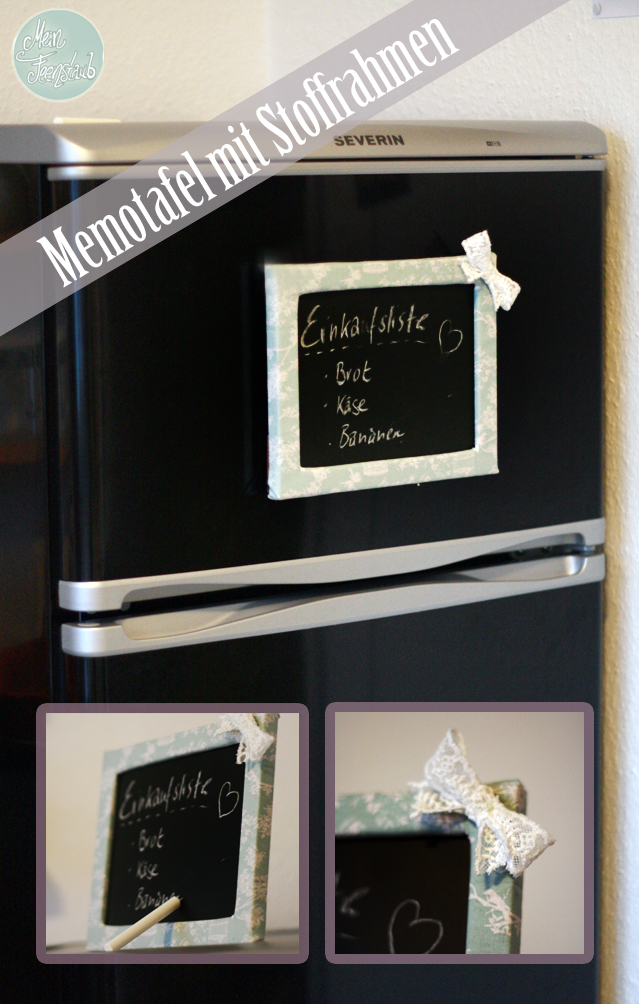 Im nächsten Eintrag zeige ich, wie ich aus einem alten Bilderrahmen, Stoffresten und Tafelfolie eine praktisches Memoboard gemacht habe, was man entweder aufstellen oder mit Magneten an der Rückseite am Kühlschrank anbringen kann.